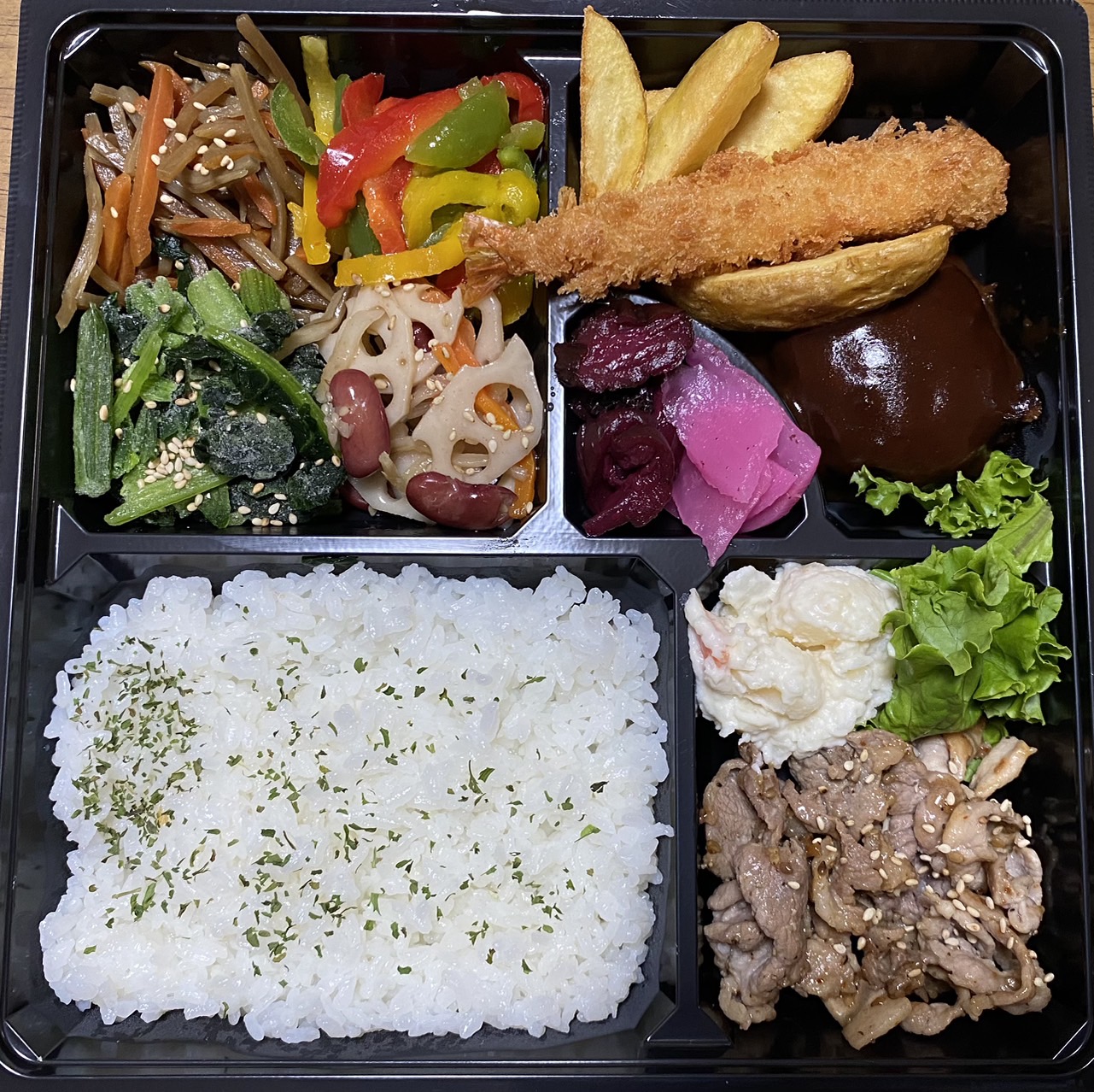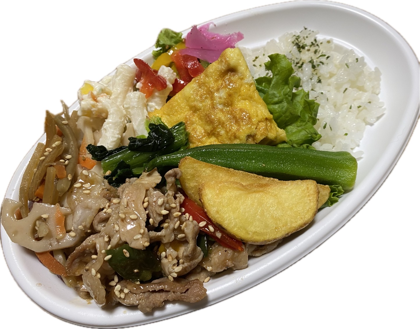 焼肉・フライドポテト・玉子焼き・マカロニサラダ・パプリカナムル・レンコンきんぴら・ほうれん草おひたし・オクラ・ごはん